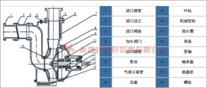 泵的工作原理:泵體內設有儲液腔,并通過上方的回流孔和下方的循環(huán)孔與泵工作腔相通,構成泵的軸向加流外混式系統(tǒng)。泵停止工作后,泵內腔已儲有一定容積的液體。當泵起動時,有關當局內的儲液在葉輪的作用下,夾帶著空氣被向上拋出,液體通過氣液分離管的網(wǎng)格回流到工作腔,氣體被排出泵外,使泵內形成一定的真空度,達到自吸的作用。
