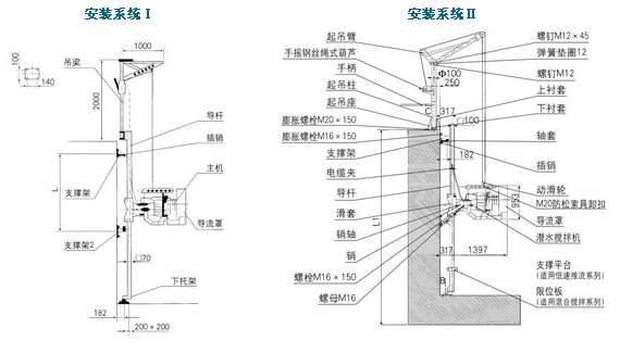 潛水攪拌機的專用安裝系統可在無需排出池中污水的情況下,能快速安裝和拆卸潛水攪拌機。當池深H<4米時建議采用安裝系統Ⅰ。潛水攪拌機的潛水深度可以根據需要進行垂直方向的調節,而且在水平面內可繞導桿旋轉的*大角度為±60°起吊系統底座、支撐架和下托架與池的有關聯接面均采用膨脹螺栓固定,無需預留孔。