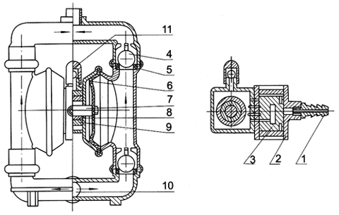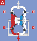 在圖中壓縮空氣由進口進入配氣閥,使膜片向右運動,則A室吸力使介質由C入口流入,推開球閥2進入A室,球閥4則因吸入閉鎖,B室中的介質則被擠壓,推開球閥3由D流出同時使1閉鎖,防止回流,就這樣循環往復使介質不斷從C入口吸入D出口出排出。