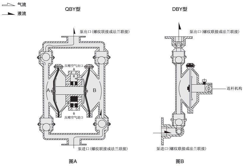 QBY氣動隔膜泵有兩個對稱的工作腔,各裝有一塊彈性隔膜,連桿軸將兩塊隔膜聯接,當壓縮空氣由進氣接頭經配氣閥進入A工作腔推動隔膜,該腔進口球閥關閉,出口球閥打開,液體排出,于此同時,B腔隔膜由連桿軸驅動背面氣體排入大氣,出口球閥關閉,進口球閥打開,液體被吸入(見圖A)。當行程到達終點,配氣閥將氣體導入B工作時,情況同前述相反,B腔排出液體,A腔吸入液體。如此反復,泵不斷吸入排出液體。