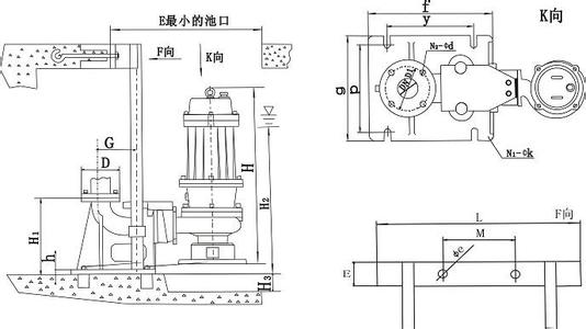 潛水電泵出水法蘭與出水管路系統自動對接的自動耦合裝置,由潛水電泵出水法蘭、附加耦合法蘭和出水管座進口法蘭組成,在附加耦合法蘭和出水管座進口法蘭的兩側各有一對楔卡且楔點的位置在法蘭的水平中心線附近。當潛水電泵從水坑上方降落時,附加耦合法蘭兩側的楔卡和出水管座進口法蘭兩側的楔卡就卡到一起,在潛水電泵自重和楔卡斜面的作用下,兩個法蘭面緊緊地貼在一起,就好比兩個法蘭的兩側用兩個螺栓上緊了一樣,潛水電泵的水壓再大也不能推開法蘭面而大量漏水。當潛水電泵從水坑內往上提起來時,兩對楔卡能夠沿斜面方便的脫開,從而實現自動耦合裝置的功能。它可以在方便潛水電泵自動裝拆的同時,解決耦合的兩個法蘭之間大量漏水的問題,從而節約能源。 (2)自動耦合式潛污泵的安裝方式 自動耦合式潛污泵安裝主要是耦合裝置的安裝和泵的吊裝。安裝前在泵吊環上系上鏈鎖,供起吊與下泵之用。 耦合裝置的安裝步驟:偶合架用四個螺栓固定于泵體;出水管固定于基底;定位錐體安裝于出水管座;導管下端套在定位錐體上,上端套在導桿架的橡膠塊上;*后將導桿架固定于水池壁。橡膠塊的作用:用導桿架上的螺釘調節橡膠塊的軸向壓緊程度,使橡膠塊的直徑與導桿內徑相吻合,讓導桿穩定。 泵的安裝步驟:起吊水泵,將耦合架上的導向孔對準導桿,徐徐放下吊索,使泵沿導桿自由下滑,泵體出口與出水管座口即自動對準;松開吊索,在泵的自重作用下,使耦合架上的斜面與出水管座上相對應的斜面楔緊,泵體法蘭面與出水管座密封面即可緊密貼合,這樣就實現了泵和出水管座的自動耦合。需要起吊時,只需拉起吊索,使泵和耦合架與出水管脫開,將泵與耦合架沿導桿拉起即可。